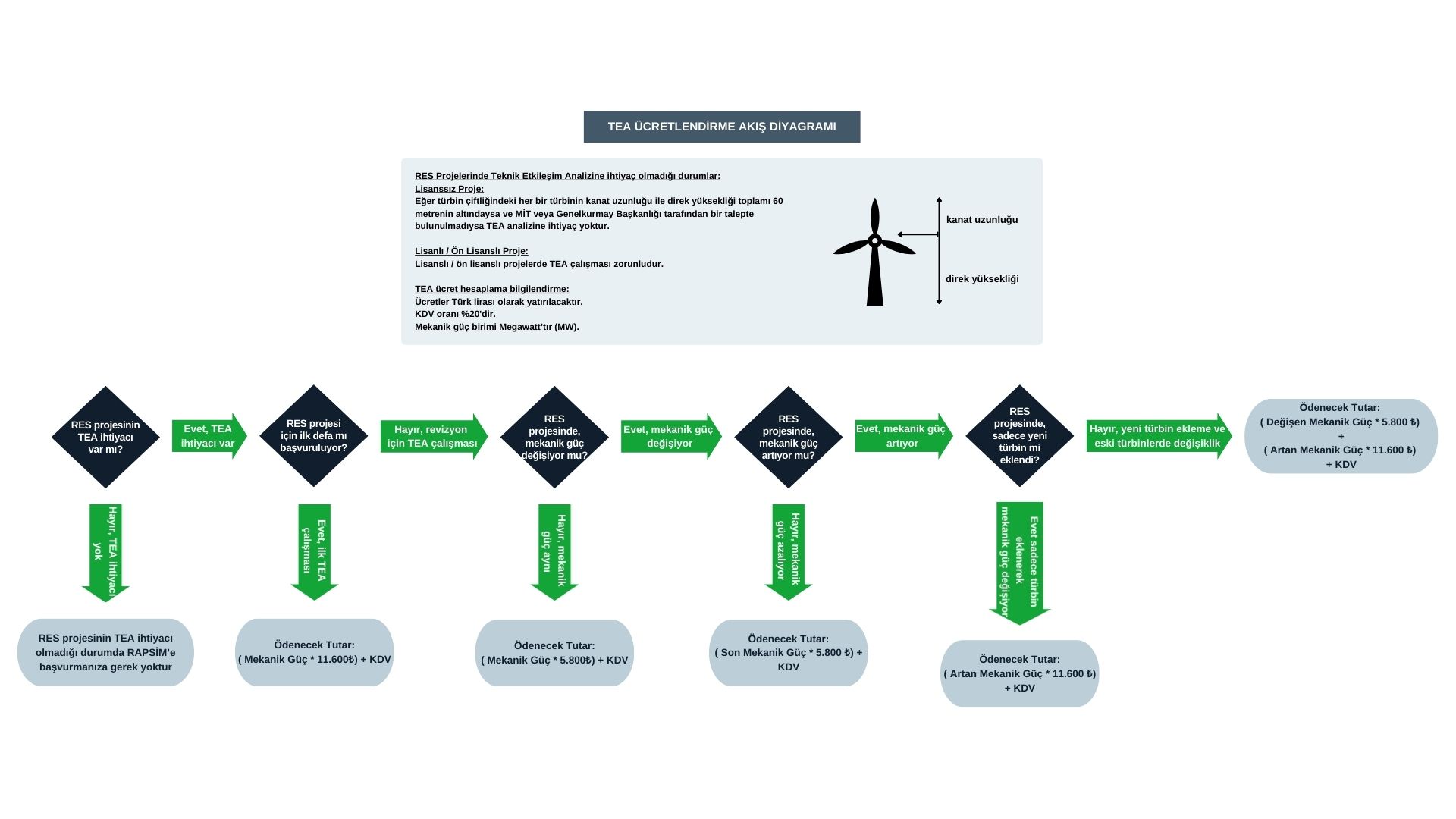 - Mekanik güç birimi MW olup, ücretlendirme hesaplamalarında ondalık güç değerlerinde virgülden sonraki kısım da hesaplamalara dâhil edilmektedir. Örneğin, toplam mekanik gücü 1,5 MW olan ve daha önce TEA yapılmamış bir proje için ücretlendirme hesaplaması: